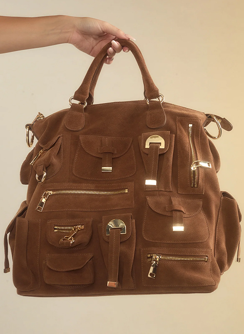 Brown Suede Cargo Pocket Top Handle BagDetails: