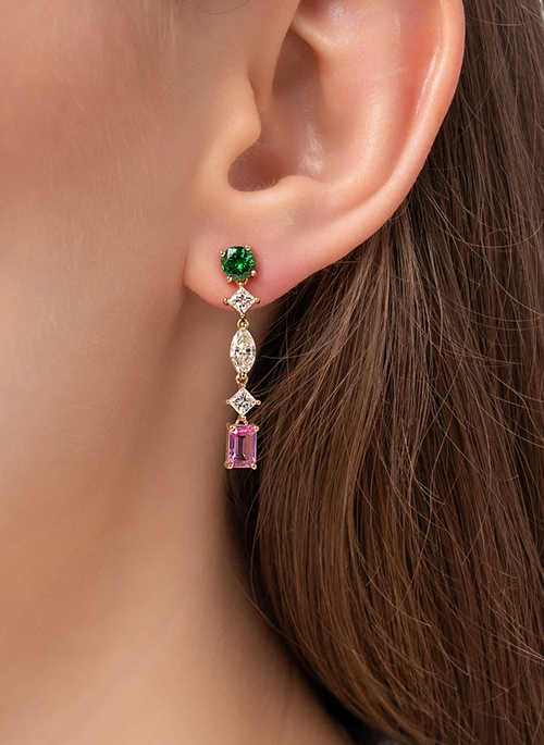 Crafted in 14K yellow gold, these exquisite dangle earrings feature a captivating mix of diamond cuts, totaling approximately 1.41 ctw (H color, VS2 clarity). Round, pear, marquise, and emerald-cut diamonds create a brilliant interplay of light, complemented by vivid green stavorite and striking pink emerald-cut sapphires (2.12ctw). A graceful fusion of color and elegance, perfect for those who appreciate refined artistry.