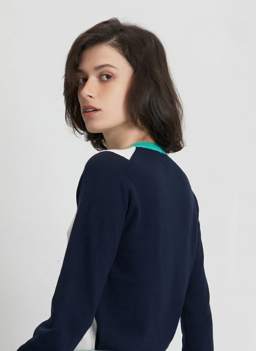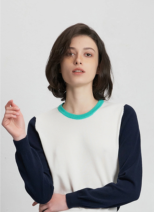 Off white & midnight blue colorblock cashmere blend sweater with a pop light green neckline to color your wardrobe. This knitted lightweight sweater is made from pure cashmere and cotton: naturally biodegradable and durable for all spring/summer occasions.Details: