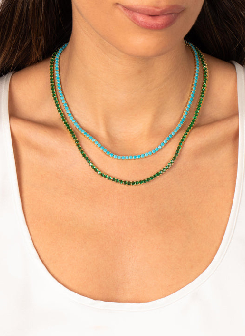 The Colored CZ Tennis Necklace by Adina Eden is a refined Necklace that balances simplicity and shine. Vibrant, elegant, and made to move, this tennis necklace comes in Turquoise and Emerald Green. When you want your outfit to feel complete, this flexible piece blends into your style so well, it feels like it was always there. Blend this gold plated tennis necklace layered with finds in the Lariat Necklaces collection for an expressive, stackable moment. Even your simplest looks feel curated when you add this piece.