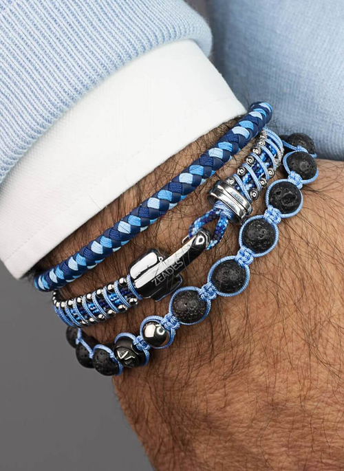 Bracelet COSMOPOLITAN 6S Wind breathes the Mediterranée at its fullest : genuine Italian leather, handcrafted with an elaborated braiding mix of different shades of "Le Grand Bleu" in a bold 6mm diameter. The graphical clasp with the ZS Cosmopolitan pattern adds on this stylish refined design, assuring good fitting thanks to a combination of magnet and screw down system.