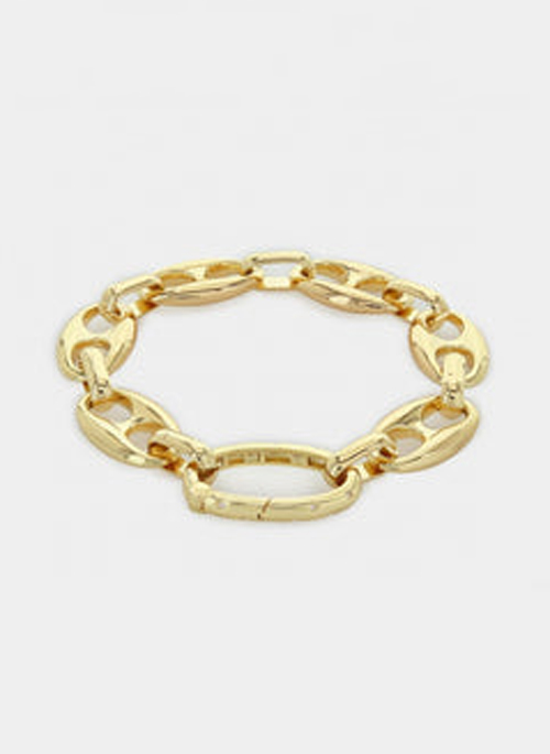 Details: Customizable Bracelet with large link chain. For interest add a charm Freeform heart 7 inch gold plated chain with a cz adorned clip closure. Charms are attached directly to the cz adorned clip closure.