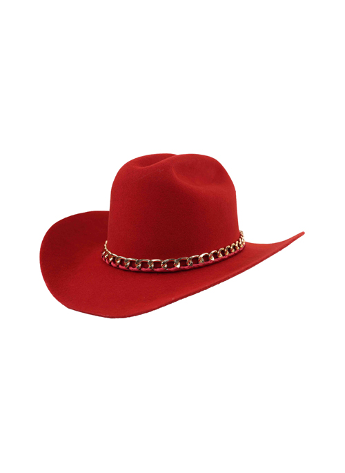 Inspired by the surreal beauty of Dali’s world, this wool western hat blends classic craftsmanship with contemporary allure. The structured crown and sleek brim are elevated by a polished gold chain that wraps the base, creating a perfect balance of western heritage and high-fashion artistry.