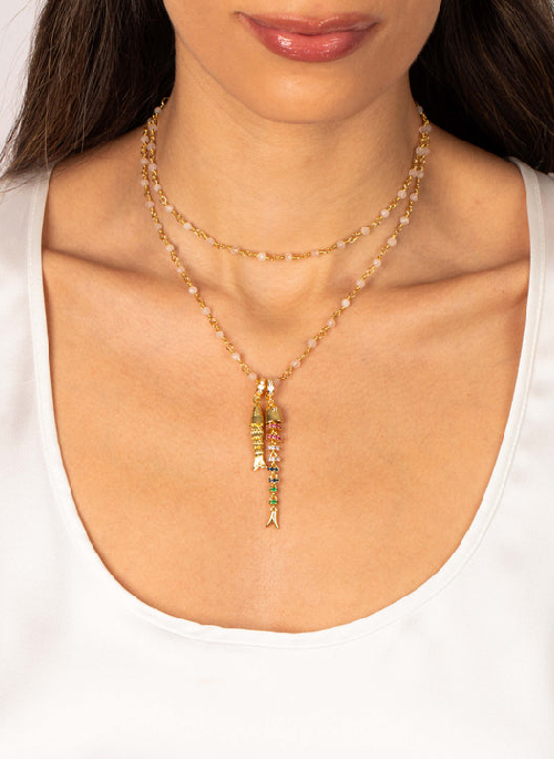 Add statement appeal to your look with the White Beaded Double Fish Necklace by Adina Eden, a must-have Necklace. This necklace for women makes accessorizing easy with Gold options for every occasion. When comfort meets confidence, no matter the outfit, this piece offers that low-effort, high-reward finish we all love. Pair this gold plated necklace with selections from the Lariat Necklaces collection to make your everyday styling effortless. It's refined, reliable, and made to be styled again and again.Details: