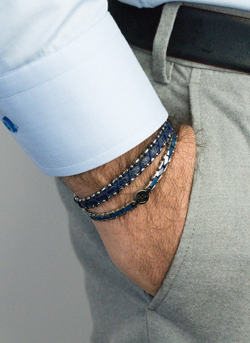 Bracelet DROMON Abyss.AB in Abyss Blue genuine Italian leather, handcrafted with an elaborated braiding mix of different sized steel beads and a techno-rope in ton-sur-ton Abyys blue color. The perfectly fitting graphical clasp with the Damier ZS pattern adds on this stylish refined design. Comes in Stainless Steel, easy to put on and off.