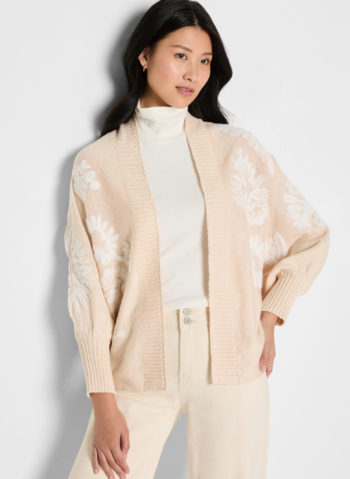 The two-tone placed pattern is what you'll notice first, but the subtle touches are what keep you coming back season after season. With its soft, touchable feel and effortless drape, our Embroidered Cardigan is as easy as it is elevated. The open-front design and ribbed placket make it endlessly versatile, while extra-long ribbed cuffs add a refined, tailored finish. Delicate embroidery brings subtle artistry, making it a standout layer whether tossed over a simple tee or styled with more polished looks.