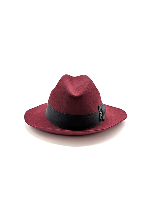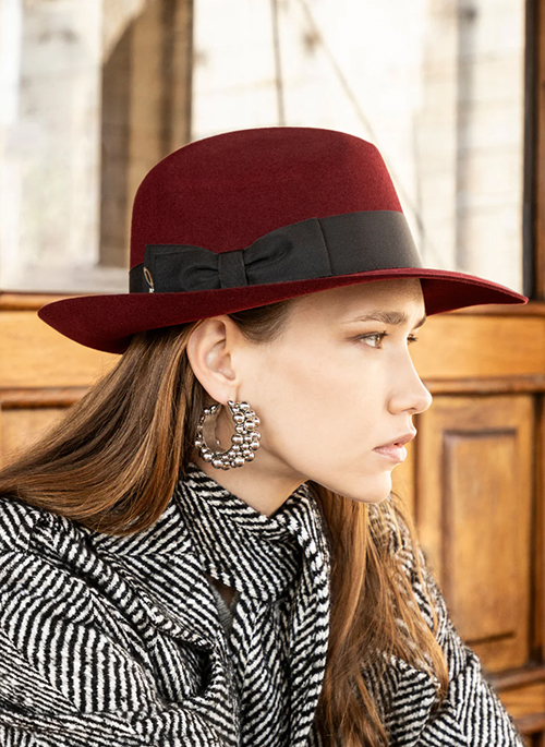 Our Dalida is a Fedora hat made of Smooth lapin felt in a clincher-red color that combines elegance and sophistication: its classic shape is enhanced by a charcoal-colored grosgrain belt and a Doria bow with a gold brass logo, details that enhance the quality of craftsmanship. Soft and lightweight, it provides comfort and distinctive style, ideal for those seeking a sophisticated and durable accessory.Details:
