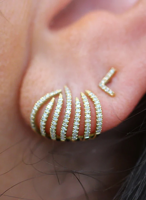 Crafted in 14 karat yellow gold, these earrings feature a dynamic flame-inspired silhouette, set with approximately 0.36 carats total weight of small round diamonds. The rising contours evoke the energy of fire, while the diamonds add a refined brilliance. A bold yet elegant design made for those drawn to expressive form.