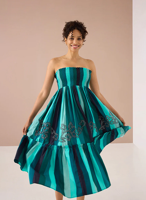 Bold stripes printed on crisp cotton poplin, our Frida Skirt Dress can be worn as a maxi skirt or strapless dress. Smocked bodice allows for an easy and flattering fit. Detailed with a ruffled skirt tier for a touch of whimsy, and hand embroidered by artisans in India. Pair with our matching Lynn Top for a full look!Details: