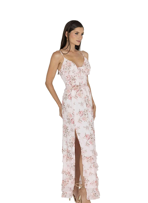 Elevate your wardrobe with the Hailey Carmen Dress. Designed with a high side front slit and delicate ruffle detailing, this dress exudes a feminine charm. The vintage silhouette combined with modern touches creates a unique and structured piece. Complete with subtle lace layers and bow-tie accents, this full-length corset gown is the epitome of elegance.