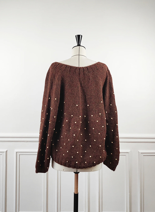 Hand-knitted sweater with seamless construction. White wooden beads embellishmentDetails: