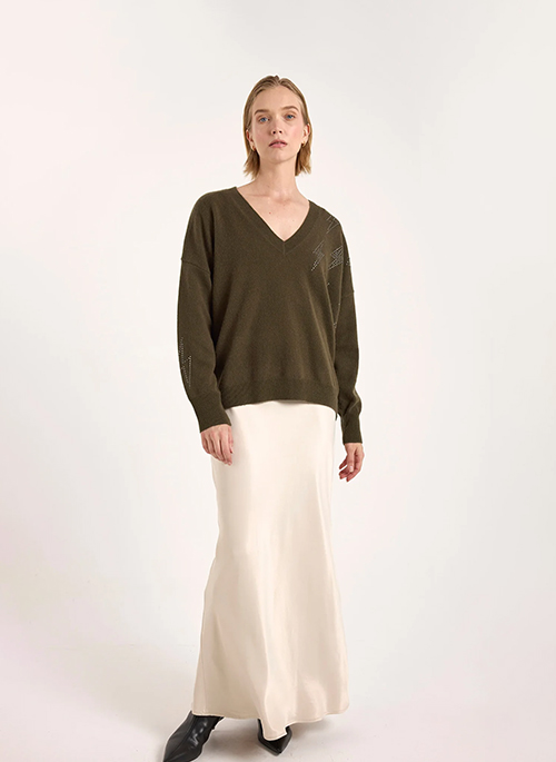 The Hazel Hotfix Bolt Cashmere V-Neck Jumper combines luxurious softness with bold, sparkling detail. Crafted from 100% Grade-A Mongolian cashmere, this V-neck jumper features lightning bolt gem embellishments for a playful, statement-making finish. Its soft, lightweight knit and classic silhouette make it ideal for layering or wearing alone. Cut in a regular fit that sits at the top of the hip, Hazel pairs effortlessly with tailored trousers, skirts, or denim for versatile, polished styling.Details: