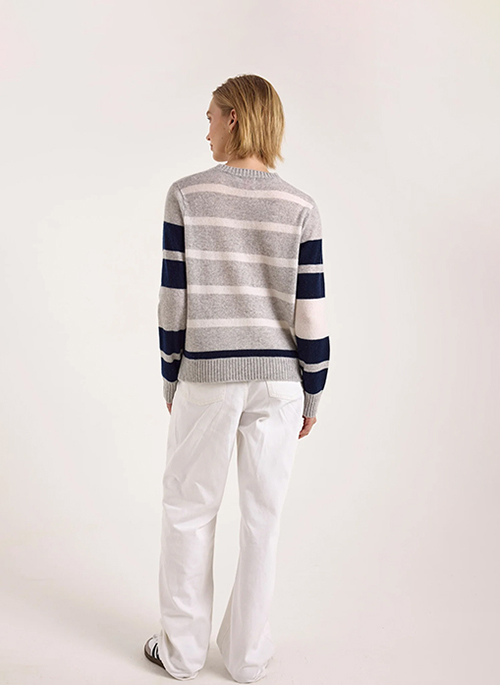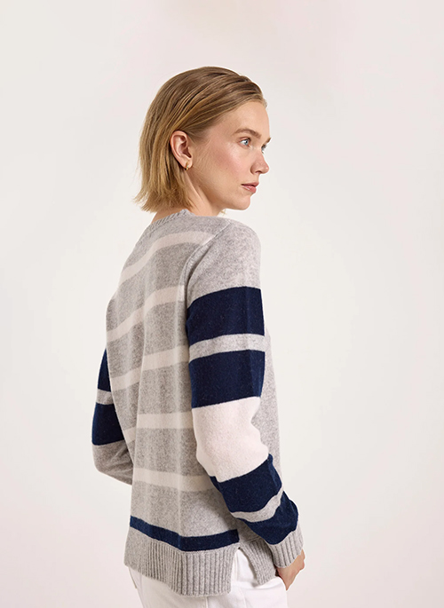 The Irregular Stripe Cashmere Crew Neck Jumper brings a modern twist to a classic silhouette. Crafted from 100% Grade-A Mongolian cashmere, it features an abstract irregular stripe design. Soft and lightweight, it offers effortless everyday luxury. Designed in a regular fit that sits at the top of the hip, this elevated essential pairs perfectly with denim, tailoring or relaxed weekend layers.Details: