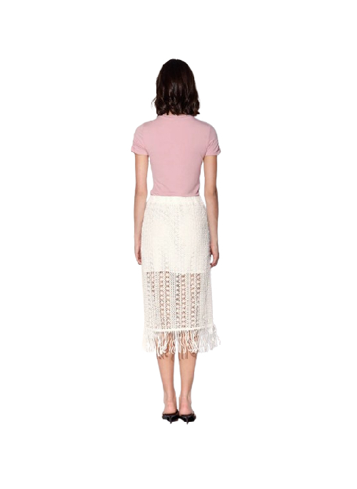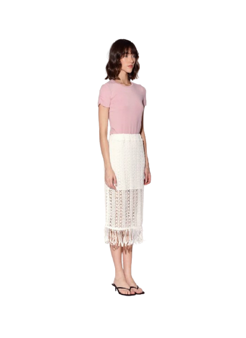 The Ivanna Skirt is a cool column shape in our intriguing crochet fabric. This midi length look with fringe accent is even more stylish when worn with the Izzy Top