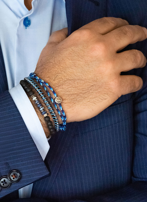 Bracelet JANGADA is a contrarian expression of combining the perfectly polished and shining Lapis Lazuli stones - in a slim rice-shape - together with the natural rough black Lava beads, finished with the technical hexagonal interesections. Adjustable, ZS tag and metal elements all in 316L Stainless Steel.