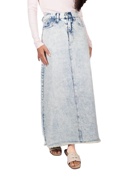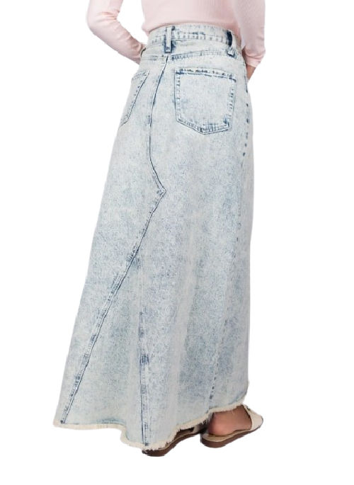 WELCOME OUR NEW DENIM SKIRTS TO YOUR EVERYDAY WARDROBE. THE JILL IS A STUNNING MID-WAISTED ACID WASH MAXI SKIRT WITH A STRAIGHT SILHOUETTE AND RAW HEM. ENJOY CREATING VARIOUS OUTFITS WITH THIS VERSATILE AND MULTI-SEASONAL PIECE. MOVE FREELY AND MODESTLY IN THIS GARMENT, AND PAIR IT WITH YOUR FAVORITE YB TOP OR SWEATER!