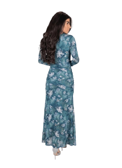 BRING VIBRANT ELEGANCE TO EVERY OCCASION WITH THIS STUNNING TROPICAL-INSPIRED MIDI DRESS. THE RICH TEAL AND BLUE TONES PAIRED WITH SOFT FLORAL DETAILING CREATE A STRIKING, EYE-CATCHING LOOK. DESIGNED WITH FIGURE-ENHANCING RUCHING ALONG THE FRONT, THIS DRESS BEAUTIFULLY SHAPES AND FLATTERS YOUR SILHOUETTE. THE LONG SLEEVES ADD A TOUCH OF SOPHISTICATION, WHILE THE STRETCHY, COMFORTABLE FABRIC ALLOWS FOR EFFORTLESS MOVEMENT—PERFECT FOR EVENTS, VACATIONS, OR A STANDOUT EVERYDAY LOOK.