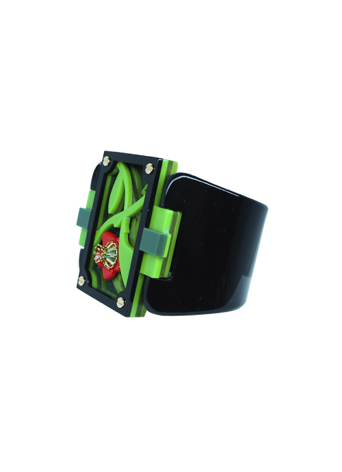 Acrylic bracelet, handmade, articulated, with glass bead, metal clasp, metals with golden finish.