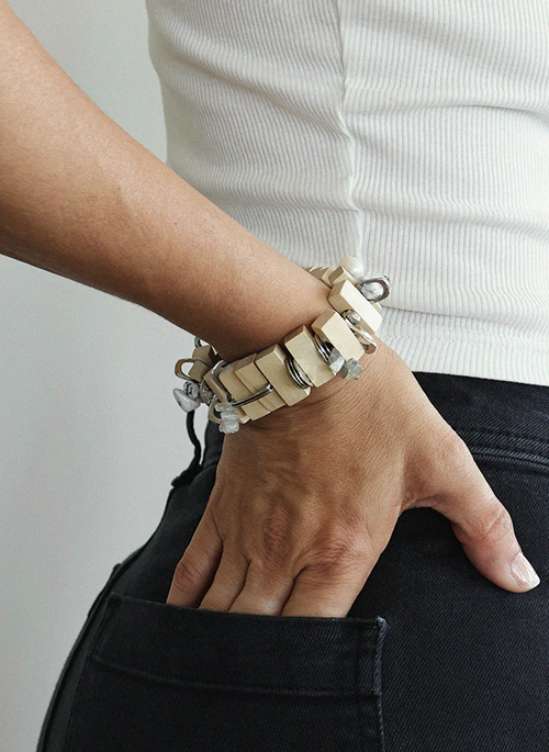 The Kilonov bracelet gathers a constellation of textures and colors. Slivers of natural wood flow gracefully, interspersed with jasper, quartz, agate, and freshwater pearl. Between each segment, touches of natural or 22K gold-plated pewter trace an organic, structured path. An easy-to-slip-on elastic bracelet with a presence both celestial and grounded — like wearing a fragment of the universe on your wrist.Details: