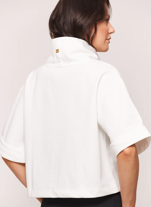 Make an effortless statement with this turtle-neck sweatshirt, with its wide short-sleeves and dramatic collar. Its cozy yet breathable horizontal ribbed texture makes it the perfect piece for pre- and post-training commutes.