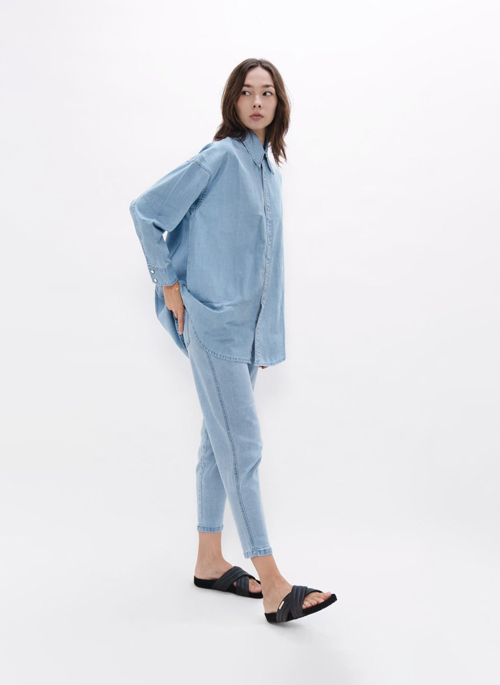 Details:Oversized fitStatement collarRounded hemLong cuffed sleevesButtoned-up front and cuffInverted pleat detail at the backDesigned from leftover fabrics and recycled plastic bottles