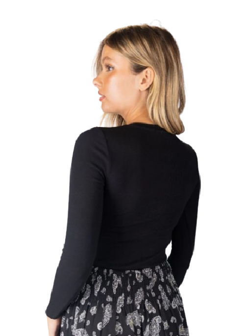 A TRUE WARDROBE ESSENTIAL, THIS BLACK SHORT-SLEEVE TEE IS DESIGNED WITH A SLEEK, FITTED SILHOUETTE THAT FLATTERS EVERY FIGURE. CRAFTED IN A SOFT RIBBED KNIT WITH JUST THE RIGHT AMOUNT OF STRETCH, IT PAIRS EFFORTLESSLY WITH DENIM, SKIRTS, OR LAYERED UNDER JACKETS. TIMELESS, VERSATILE, AND ENDLESSLY WEARABLE, IT’S THE PERFECT BASE PIECE FOR ANY SEASONDetails: