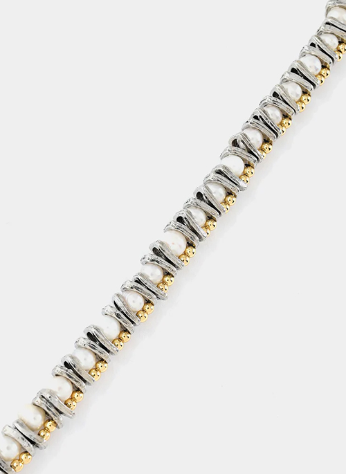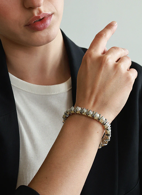 Like a deep and controlled current, the Malstro bracelet flows with both strength and elegance. It contrasts the raw texture of natural pewter with the iridescent softness of freshwater pearls. Gold-plated stainless steel beads punctuate the piece with a touch of sunlit warmth. This bracelet carries a bold presence — powerful without excess, distinctive without loudness.Details: