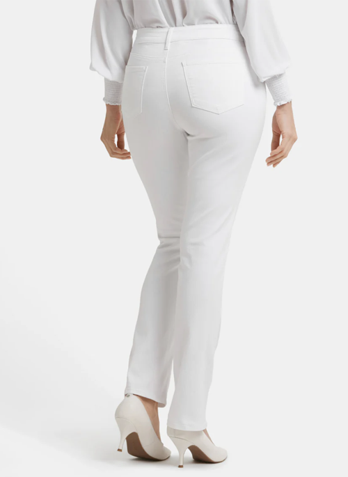 This classic fit can do no wrong. The easy, figure-elongating construction of NYDJ's Marilyn Straight Jeans in Optic White pairs well with everything, thanks to a flattering waist and a versatile straight-leg fit. Our Lift Tuck® Technology uses a proprietary slimming panel with a patented criss-cross design to shape and support your curves for an always-sleek silhouette. Features classic five-pocket styling and a zip fly with button closure. This jean is made with earth-friendly methods that result in reduced consumption of water, chemicals and/or energy.