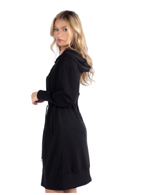 THIS SLEEK HOODED DRESS COMBINES ATHLEISURE EASE WITH ELEVATED TAILORING, FEATURING A FULL ZIP FRONT, CINCHED DRAWSTRING WAIST, AND STRUCTURED YET SOFT FABRIC THAT FLATTERS EVERY FIGURE. DESIGNED FOR MOVEMENT AND VERSATILITY — PERFECT FOR CASUAL DAYS, TRAVEL, OR LAYERING WITH STATEMENT OUTERWEAR.