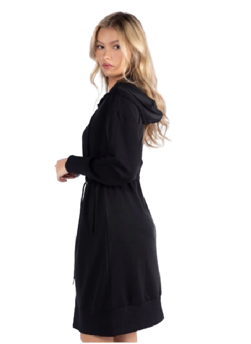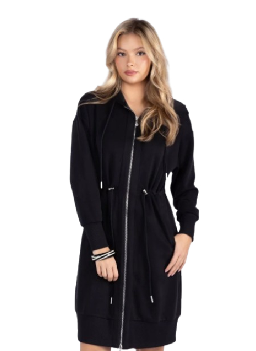 THIS SLEEK HOODED DRESS COMBINES ATHEISURE EASE WITH ELEVATED TAILORING, FEATURING A FULL ZIP FRONT, CINCHED DRAWSTRING WAIST, AND STRUCTURED YET SOFT FABRIC THAT FLATTERS EVERY FIGURE. DESIGNED FOR MOVEMENT AND VERSATILITY — PERFECT FOR CASUAL DAYS, TRAVEL, OR LAYERING WITH STATEMENT OUTERWEAR.