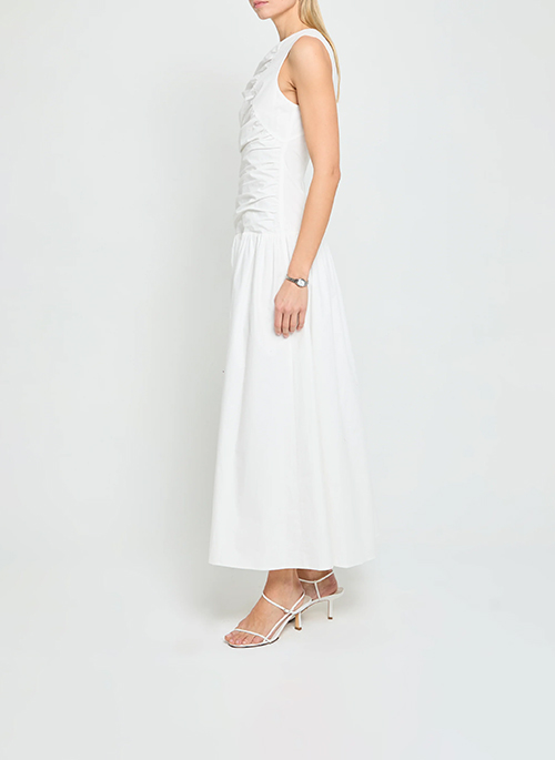 The Mirabelle Cotton Dress is expertly crafted with crisp 100% cotton for a timeless and breathable feel. The high neckline and drop waist offer a modern touch, while the gathered bodice creates a sculptural and flattering look. With its versatile design, this dress is perfect for any occasion.Details: