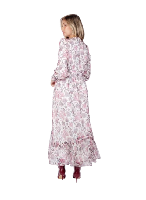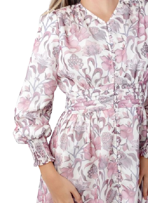 STEP INTO EFFORTLESS ELEGANCE WITH THIS FLORAL MAXI DRESS THAT BLENDS ROMANCE AND SOPHISTICATION. DESIGNED WITH A DELICATE LILAC AND BLUSH FLORAL PRINT, THIS FLOWY SILHOUETTE FLATTERS EVERY FIGURE WHILE OFFERING BOTH COMFORT AND STYLE.THE DRESS FEATURES LONG PUFFED SLEEVES WITH SMOCKED CUFFS, A BUTTON-DOWN FRONT, AND A BEAUTIFULLY DEFINED WAISTBAND THAT ENHANCES THE SHAPE. THE RUFFLED HEM ADDS A TOUCH OF MOVEMENT AND FEMININITY, MAKING IT PERFECT FOR BOTH DAYTIME OUTINGS AND EVENING OCCASIONS.