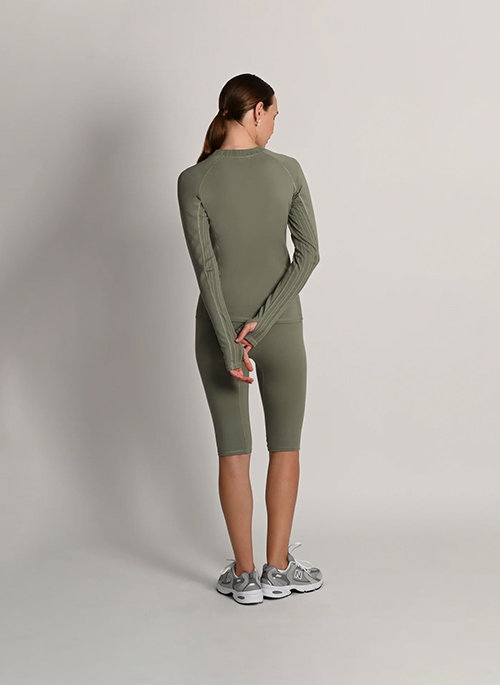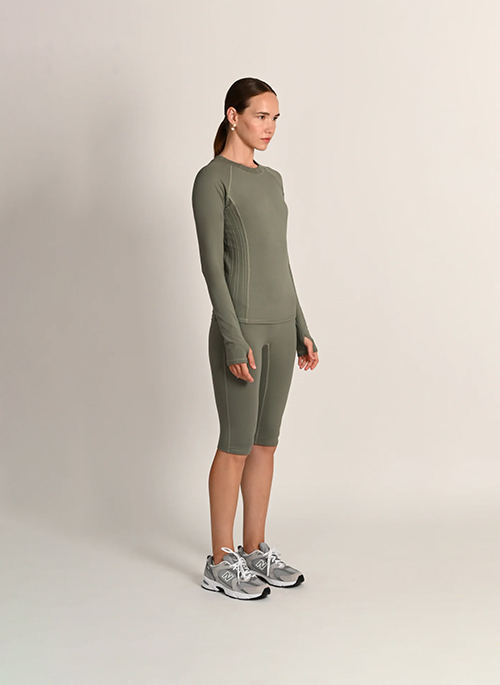 Long sleeve fitted top with ergonomic seams and thumbhole detail.