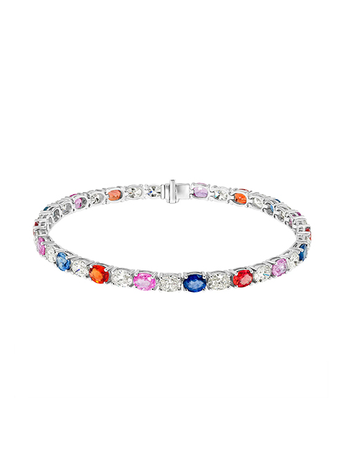 A striking 14K white gold tennis bracelet featuring a harmonious arrangement of oval diamonds and vibrant blue, pink, and red sapphires. Measuring 3.75mm in thickness and 7.5 inches in length, this piece showcases approximately 5.73 ctw of diamonds and 7.32 ctw of sapphires. A refined blend of brilliance and color, perfect for any occasion.