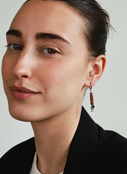 Nicta brings a subtle, sparkling glow to the face. Elongated and vibrant, these earrings pair a colored glass tube with a raw or 22K gold-plated pewter nugget, accented by gemstones and a freshwater pearl. Each element is carefully balanced, tracing the jawline and illuminating the neckline. Nicta is a play of contrasts and radiance — a touch of character to elevate the everyday with a precious light.Details: