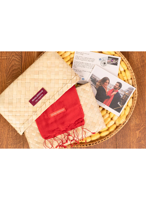 - You receive your Krama in its hand-woven natural palm leaf case.