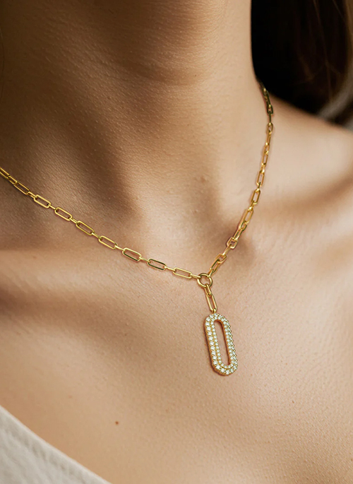 A sophisticated 18K yellow gold paperclip chain necklace featuring an exquisite oval diamond pendant. The pendant is adorned with approximately 1.43 ctw of G SI1 diamonds, offering a refined brilliance. Designed to be worn at 18 inches, this piece combines modern elegance with timeless charm.
