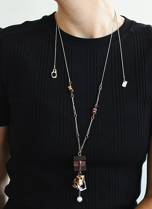 Phenix drapes like a line of light across your skin. This long adjustable necklace blends raw quartz, deep jasper, soft pearl, and warm wood for a look that's both mineral and organic. A cluster of pendants—structured yet free—adds weight and intention to the design, reinforcing its bold identity. A discreet Félice pendant in raw or 22K gold-plated pewter, paired with a geometric element, marks the path between nature and design. With its adjustable sliding clasp set on a stainless steel chain, Phenix follows the curves of your outfit with graceful ease.