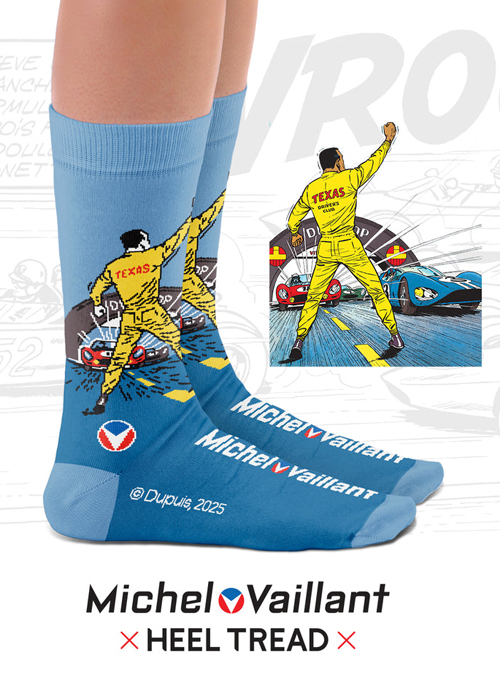 Inspired by the cover of the comic book Le 13 est au départ, these socks capture the intense duel between Michel Vaillant's Vaillante team and the American driver Bob Cramer at the 24 Hours of Le Mans. This iconic book, the 5th in the series, is a fan favorite for its gripping race action and for introducing two key figures: Michel's future wife, Françoise Latour, and the American team, Texas Driver's Club.Details: