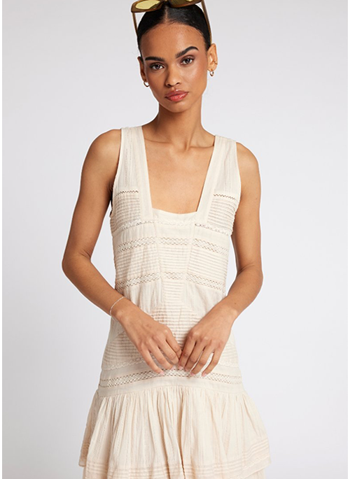 The Ruva is reminiscent of girlhood with an elegant flair. A relaxed flowing fit, featuring a drop-waist and vintage inspired detailing throughout. This playful dress is a nostalgic throwback with a modern day twist.