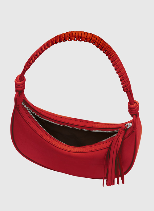 The Saige Shoulder Bag brings a refined edge to the everyday hobo silhouette. Designed with a softly rounded body and finished with knotted strap details, it hangs comfortably over the shoulder while making a statement with its minimal yet distinctive look. A tassel accent adds subtle movement, balancing its streamlined shape with a touch of playful texture.