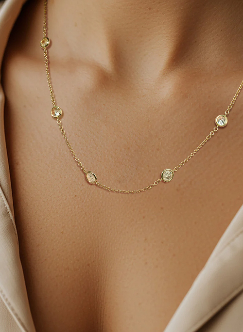 A delicate necklace crafted in 18K yellow gold, featuring ten natural round diamonds, each approximately 1.00 carat, bezel-set along a classic rolo link chain. The diamonds exhibit noticeable white inclusions, often referred to as "salty" diamonds, adding a unique character to each stone. The adjustable 16 to 17-inch length offers versatility for layering or standalone wear.