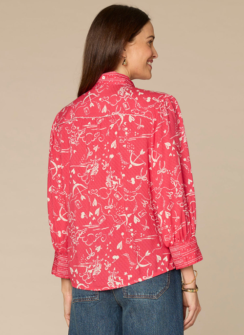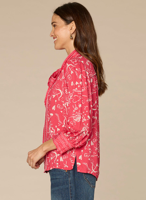 For a pop of color and festive design details, reach for this woven shirt. It has three quarter sleeves, a stand collar with a feminine self tie, button down front, scallop tipping, and an abstract print.