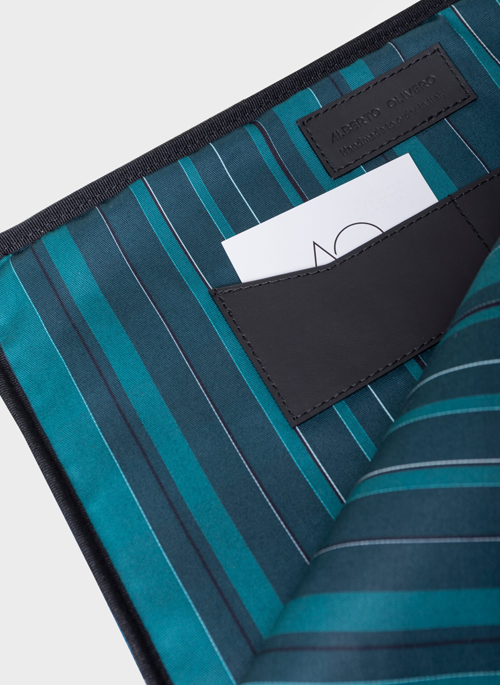 The accessory is embellished with the Alberto Olivero monogram logo in brass on the front, and a diagonal pocket with a metal zipper closure designed to keep business cards or small essentials close at hand.