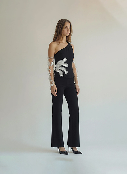 The Sophie Jumpsuit effortlessly transitions from day to evening with its refined one-shoulder silhouette and laser-decorated waist and gloves that add an unexpected touch of elegance. The sophisticated design balances modern edge with timeless appeal, making it a wardrobe essential for those who appreciate understated luxury. Sleeves are not directly attached to the jumpsuit.They can be worn or not.Details: