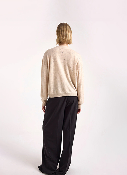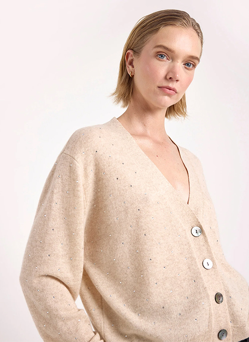 The Sparkle Cashmere Cardigan is a luxurious, party-ready knit designed to shine. Crafted from 100% Grade-A Mongolian cashmere, this button-down cardigan features iridescent buttons and delicate gem embellishments for a subtle, sparkling finish. Its loose fit sits at the top of the hip, perfect for dressing up or layering over casual outfits. The sparkle adds effortless elegance and a touch of glamour to any occasion.Details: