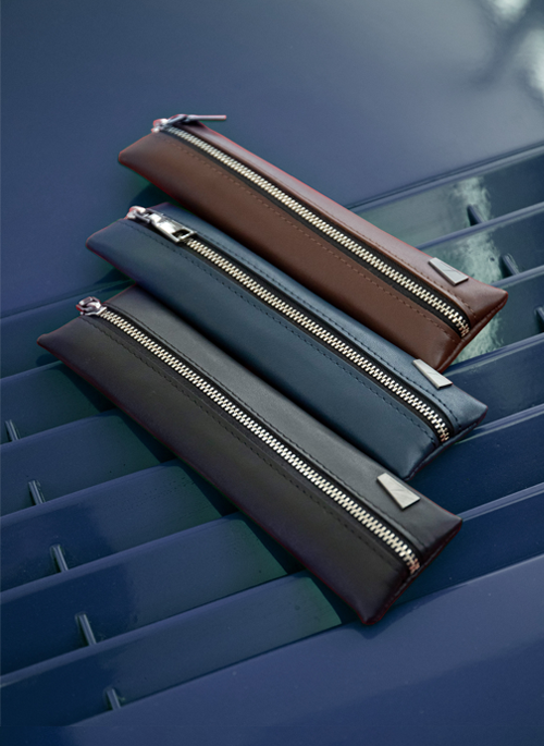 The Spindly pencil case, crafted from premium nubuck leather and embellished with the Alberto Olivero monogram in brass, is designed as a refined desk accessory.
