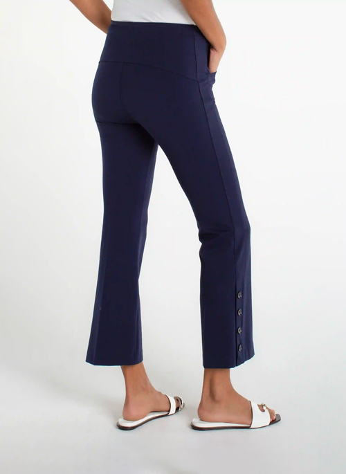 A sleek update to the classic kick flare. The Stella silhouette sits comfortably at the mid rise and opens into a chic, subtle flare that feels modern and refined. Smooth pull on construction and welt pocket detailing create a clean, tailored look, while the button accents at the hem add a stylish finishing touch.