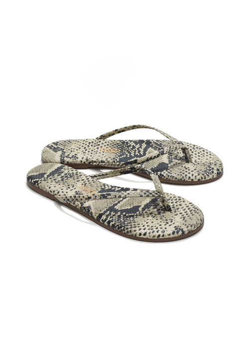 A snakeskin print on the style that started it all. Handcrafted from soft leather like material in a classic flip flop style. Love right out of the box; we added a cushioned insole and rubber outsole for extra comfort.