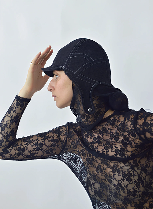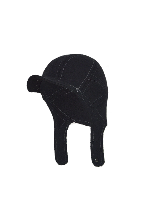 Details: Black boiled wool hatMicro-visor inspired by racing helmetsContrasting cutouts with white topstitchingSnap tabs for closure under the chin